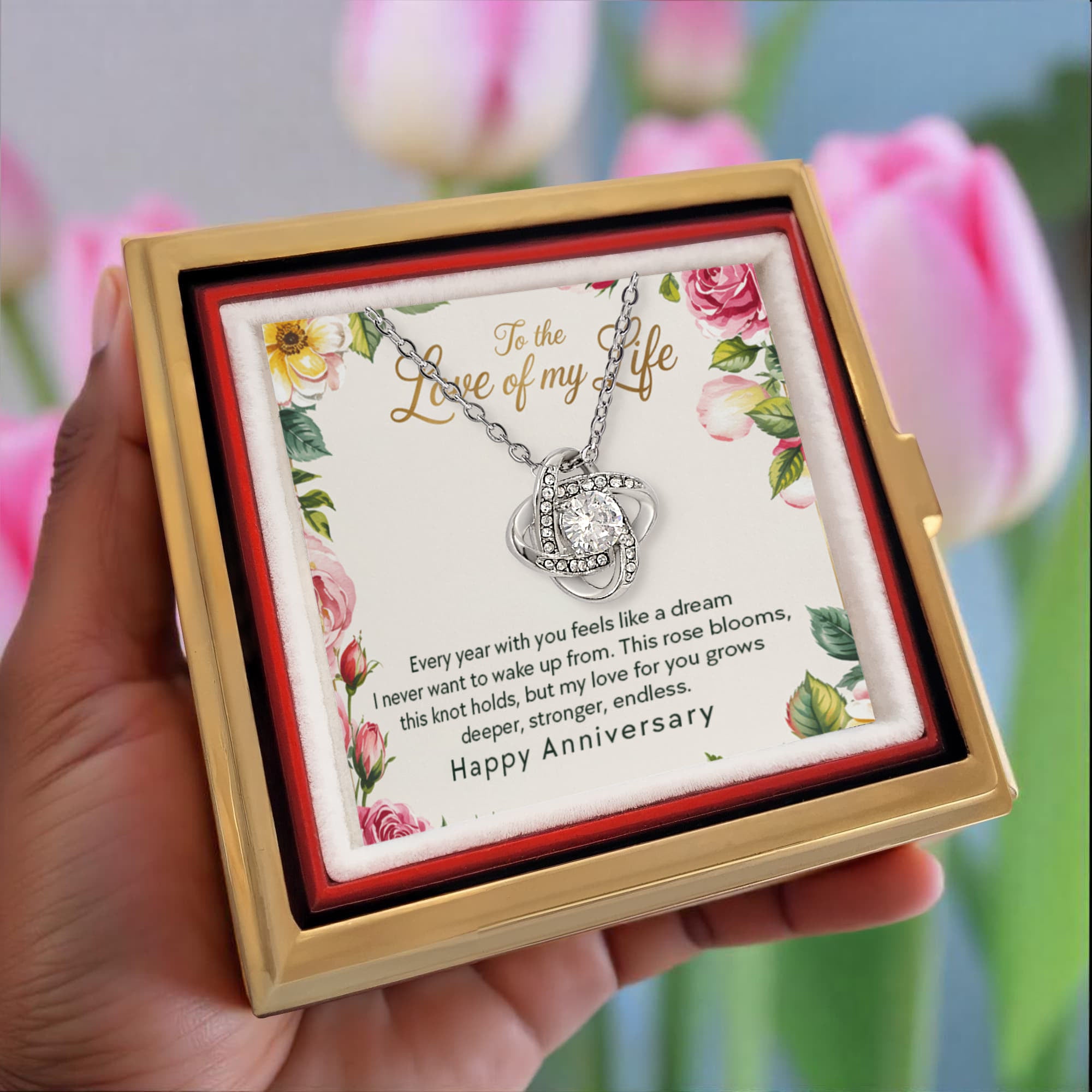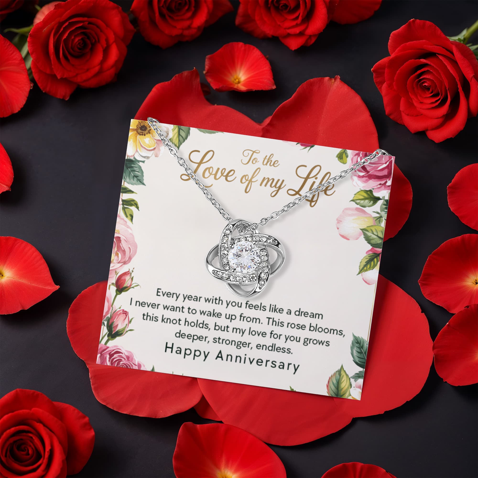 To the love of my life: Every year with you feels like a dream. I never want to wake up from. This rose blooms, this knot holds, but my love for you grows deeper, stronger, endless. Happy Anniversary.