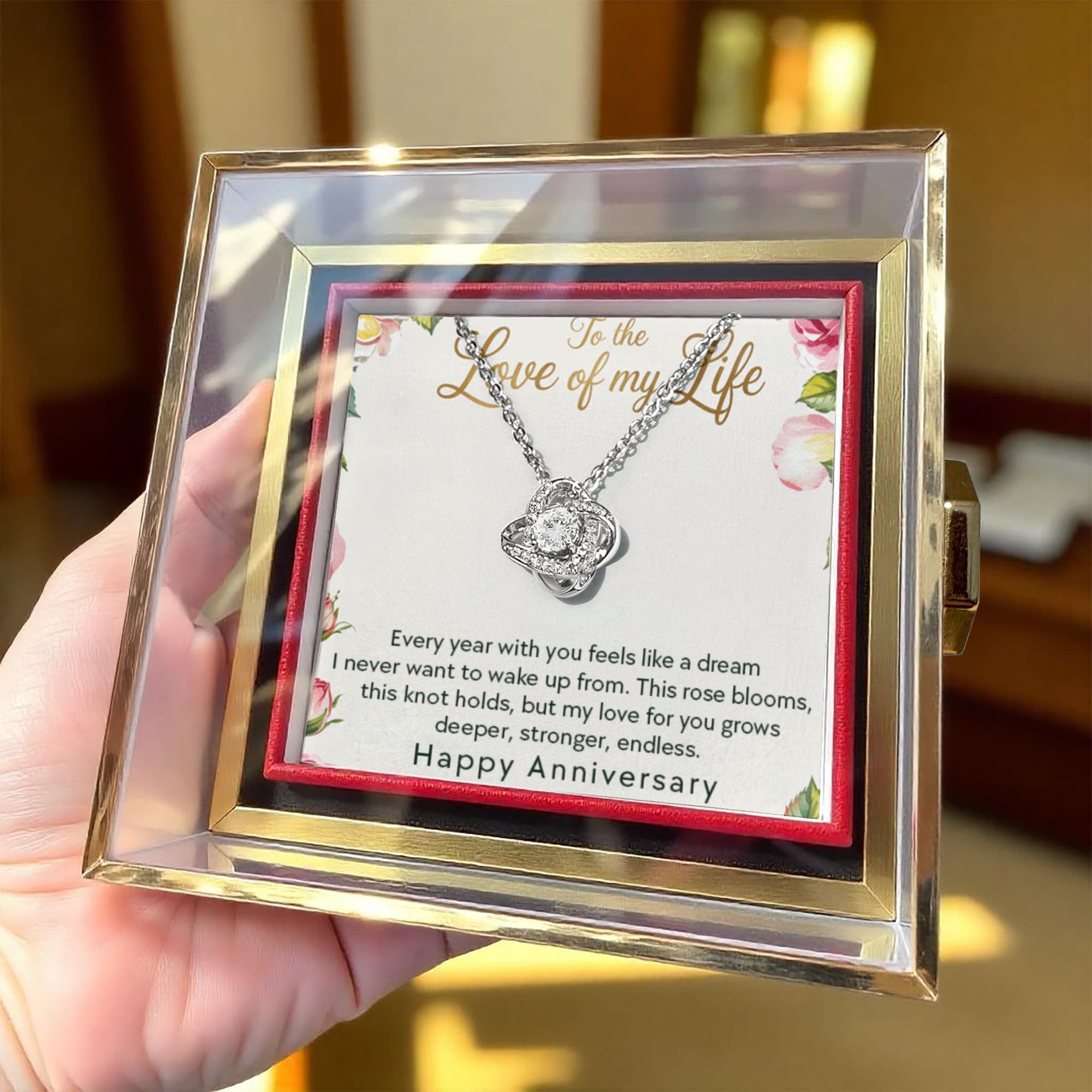 Imagine her reaction as she receives this beautiful Love Knot Necklace. Representing an unbreakable bond between two souls, this stunning pendant is adorned with premium cubic zirconia crystals, making it a timeless symbol of love and devotion. The luxurious box, featuring a meticulously preserved rose that never fades, adds an extra touch of love. With a simple turn of the gold knob, her breathtaking gift is revealed—making it the perfect sentimental gift for that special someone.